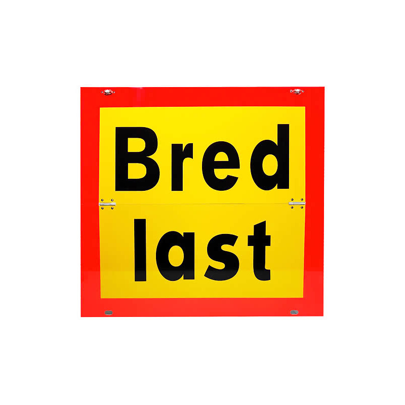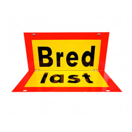 Bred Last skylt enligt de nya föreskrifterna från Transportstyrelsen. Bred lastskylt med bård, fluorescerande och gult reflekterande 2-radig 600x500x2 mm. Material: Aluminium. Utdrag ur TSFS 2023:36Fordon eller fordonståg som transporterar bred odelbar last ska framtill och baktil