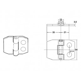 Gångjärn, med teflonsprint. Totallängd 70 mm, 35+35 mm.
