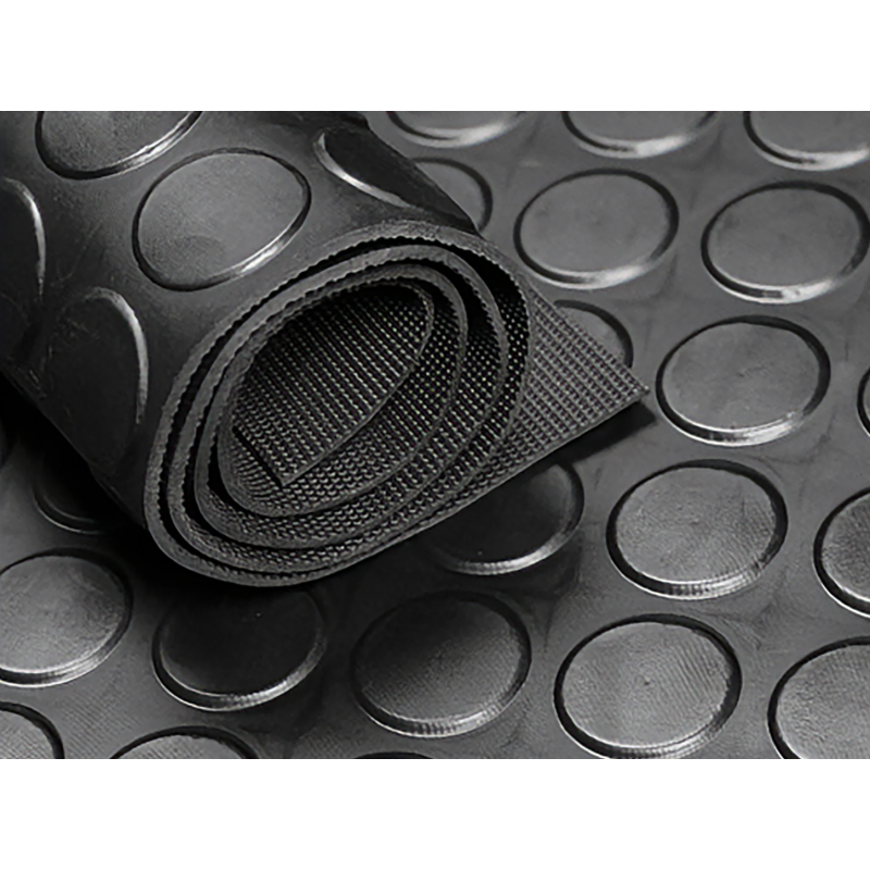 Coin Gummimatta NR/SBR 1200x3 mm Coin svart. Upphöjd cirkulär designyta på ena sidan och ett fint tygtrycksmönster på den andra sidan.