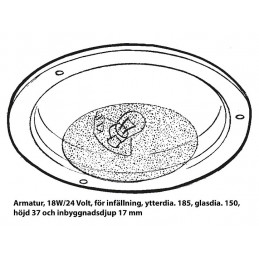 Armatur, 18W/24 Volt, för infällning, ytterdia. 185, glasdia. 150, höjd 37 och inbyggnadsdjup 17 mm.
