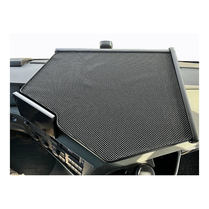 Snyggt och funktionellt, ger stor yta för förvaring av dina behov. Bordets ben återger exakt konturen av panelens yta, så bordet ligger extremt stabilt och den 7 mm höga kanten med halkskyddsmattan säkerställer att din dator, iPad eller mobil förblir säker under hela färden.