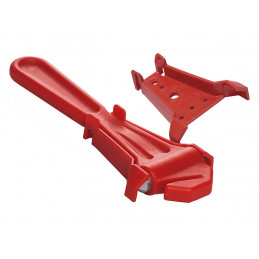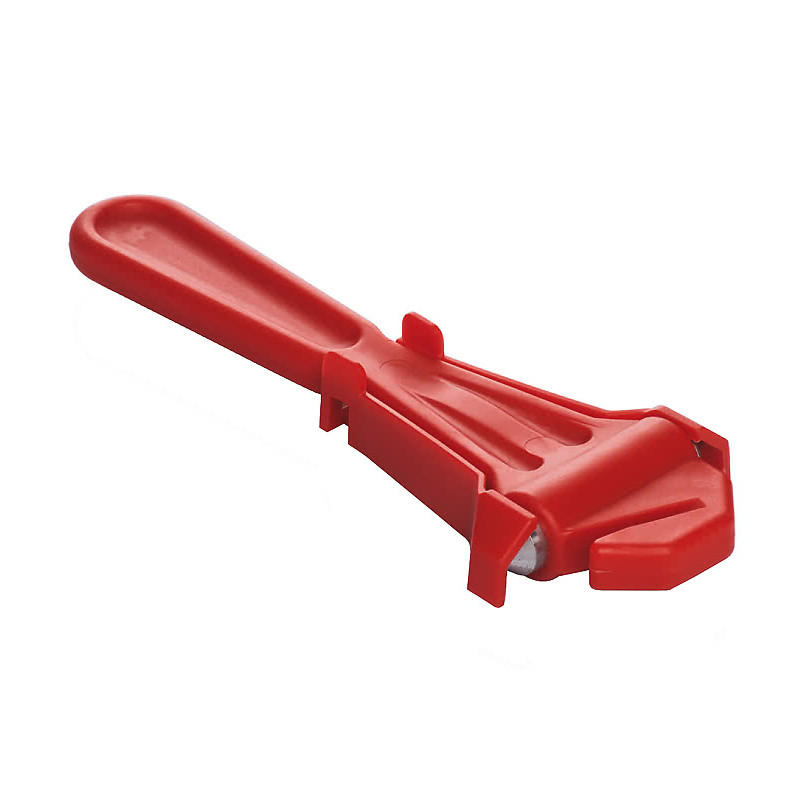 Nödhammare, röd plast inkl. hållare. Alla nödhammare är föremål för specifika tester gjorda av TÜV och utvärderade för att överensstämma med användning på härdat glastjocklek upp till 4 mm.