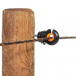 Förnyad Gallagher design. Mycket starkare än standard versionen tack vare ny teknik. Mycket hållbarare tack vare dess metallkärna. Risken för kortslutning är eliminerad. Den orange plasten indikerar när det är dags att byta ut isolatorn. För användning med trästolpar. Avstånd 10cm.