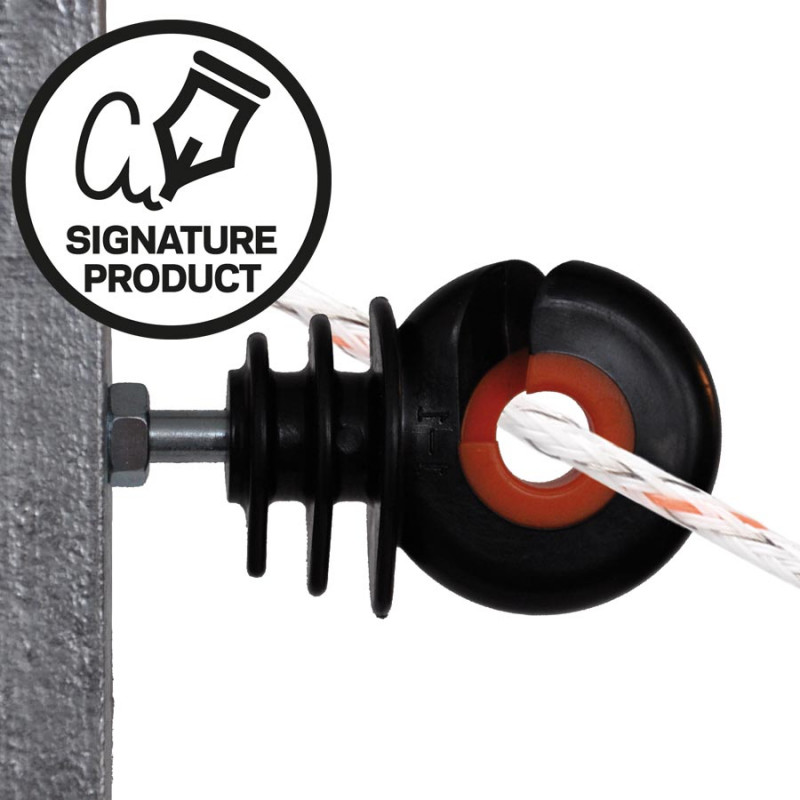 Förnyad Gallagher design. Mycket starkare än standard versionen tack vare ny teknik. Mycket hållbarare tack vare dess metallkärna. Risken för kortslutning är eliminerad. Den orange plasten indikerar när det är dags att byta ut isolatorn. För användning med trästolpar. Avstånd 18cm.