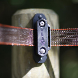 Denna bandklämma behöver du om du vill montera stängselband upp till 40 mm på en LinePost. Det är mycket enkelt att fästa bandet, med ett enda klick sitter bandet fast mellan två gummidelar, med vilka du snabbt och enkelt sätter upp stängslet.