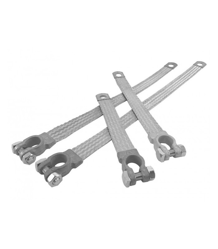 Av förtennad koppartrådsfläta med fastpressad negativ batterikabelsko av förtennad mässing. Bredd 23 mm.