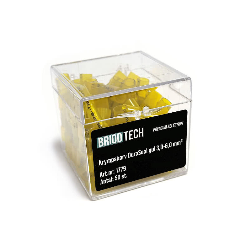 DuraSeal krymphylsa gul DS-serien Gul krympskarvhylsa DuraSeal från Raychem. Krympskarv med invändigt lim, kläms ihop och värms sedan med varmluftspistol. De avisolerade kabeländarna träs in i hylsan och pressas och sedan värms tills smältlimmet flyter ut i kanten. Detta ger en utmärkt tätn