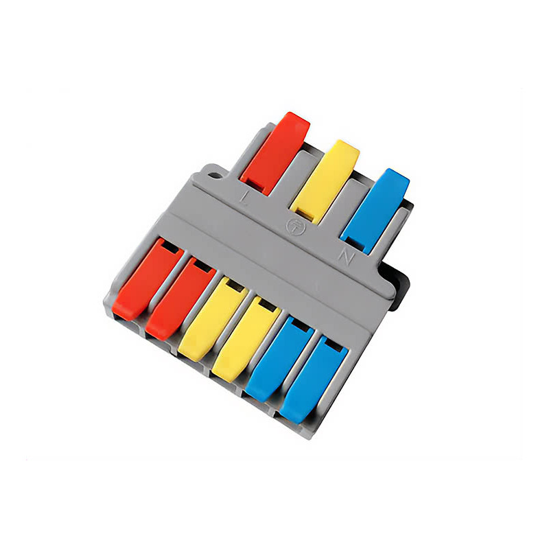 Kopplingsklämma 2-väg, 2+6-pol, för svagström. Denna kopplingsklämma kräver inga verktyg vid inkoppling; ledarna kläms enkelt fast. Kabelarean för flertrådig kabel är 0,5-4 mm² och för solid kabel är den 0,5-6 mm². Nominell ström är 38 A vid 450 V. CE-märkt.