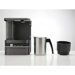 Kaffemaskinen är tillverkad i antracitfärgad aluminium med integrerad vattentank, kaffemugg/kaffetermos i rostfritt stål med separat filterenhet ovanpå.