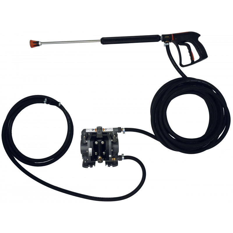 Tryckluftsdriven kempump. Material i hus och säten är Acetal, material i ventiler och membran är PT-Teflon. Kempåläggaren är avsedd för kallavfettningar samt alkaliska medel. Kit