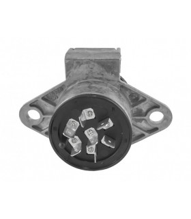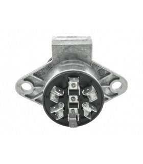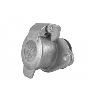 7-polig kontaktdosa av aluminium med fjädrande lock. Levereras med gummitätning. 2 fästhål, cc 75 mm. Mått för infällning: diameter 47 mm, djup 35 mm. ISO 1185, DIN 72579 - EURO.