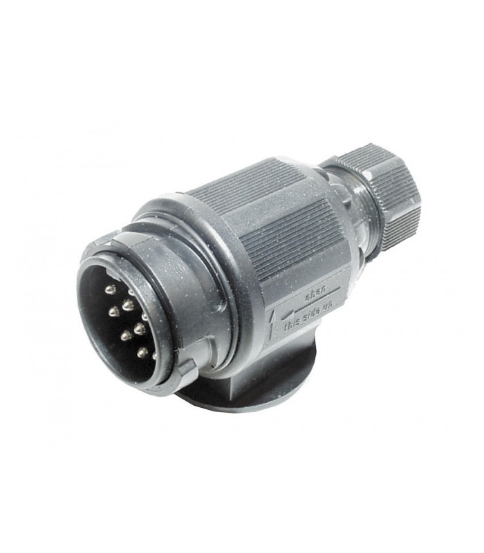 12 V. Tillverkad i slagtålig plast. 13-polig. Med bajonettfattning. (13 stift). Levereras med skruvbara kontakter. ISO nr 11446. Levereras i påse och ryttare för butik.