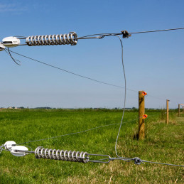 Stängselfjädern neutraliserar skillnader i trådens dragspänning orsakade av olika temperaturer. Den håller tråden lika spänd såväl sommar som vinter, vilket gör att du kan dubbla avståndet mellan stolparna. Passar ø2,5mm/2,65mm-tråd. Rostfri.