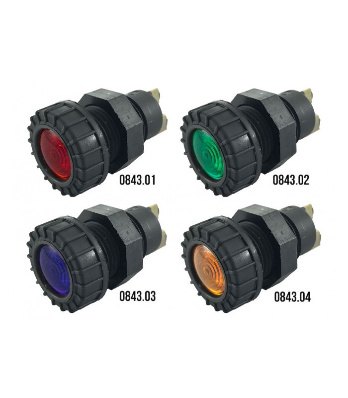 Strömbrytare med skruvanslutning. Passar håldiameter 17,5 mm. För 6-24 V med 2 W glödlampa. Djup max 10 mm. Sockel BA9s. Exkl. glödlampa. Lamphållare.