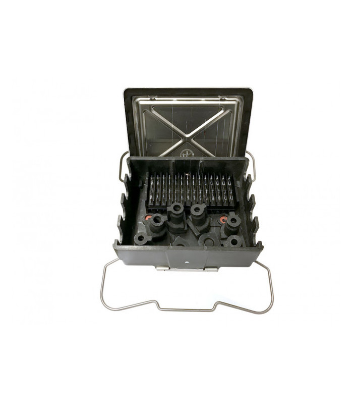 Av plast med svart lock. Bestyckad med 14-polig kopplingsplint med 56 flatstiftsanslutningar. 4 kabelingångar. Kabelgenomföringar medföljer. Storlek 146 x 101 mm. Höjd 47 mm. Fabrikat: Rubbolite.