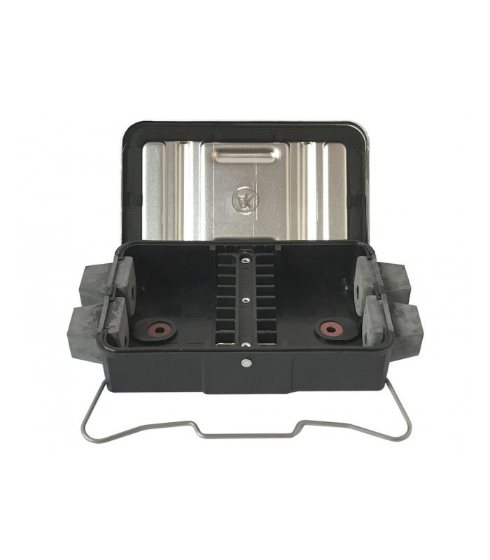 Av plast med svart lock. Bestyckad med 14-polig kopplingsplint med 56 flatstiftsanslutningar. 4 kabelingångar. Kabelgenomföringar medföljer. Storlek 146 x 101 mm. Höjd 47 mm. Fabrikat: Rubbolite.