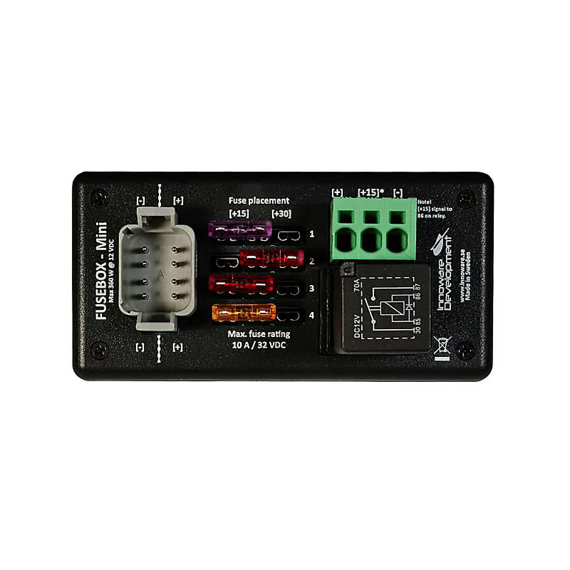 Påbyggarbox med ett kompakt format och DT anslutningar på utsidan för enkel kontaktering. Koppla all din utrustning via samma elcentral så underlättas både inkopplingen och även servicen med denna box. • LED på framsidan som visar status för +30 & +15 spänning samt vilka reläer som är aktiv