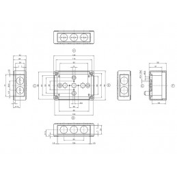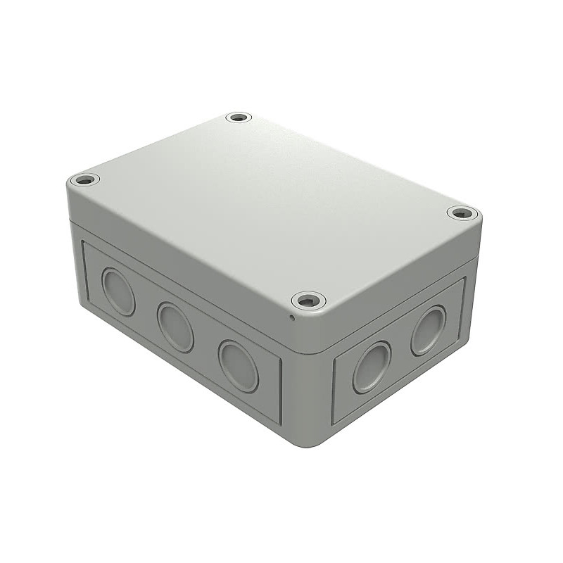 Av bakelit med lock av aluminium. Bestyckad med 6-polig integrerad kopplingsplint med skruvanslutningar. 4 kabelingångar. Kabelgenomföringar medföljer. Storlek 120 x 69 mm. Höjd 30 mm. CC 29 mm.