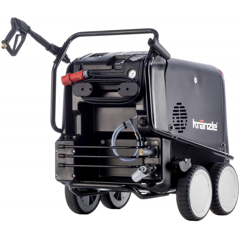 • Kränzle radpump • Snabbkopplingssystem D12 • Säkerhetsfrånslagning • Tryckreglering • Totalstoppsystem med fördröjd motorfrånkoppling • Insugning av rengöringsmedel • Parkeringsbroms • Vattentank: Volym 12 l • Tillval: värmeslinga i rostfritt