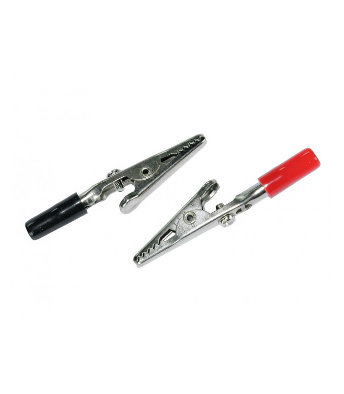 Förnicklad krokodilklämma med isolerad hylsa. Längd: 52 mm. Röd eller svart.