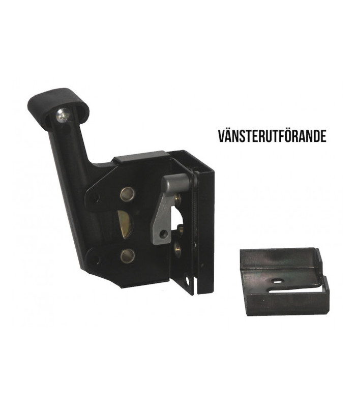 Hyttlås, höger, svartlackerat, inklusive monteringsbleck och skyddskåpa, med låsarm för nivåmekanism.