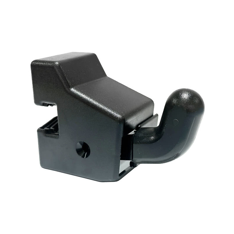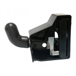 Hyttlås, höger, svartlackerat, inklusive monteringsbleck och skyddskåpa, med låsarm för nivåmekanism.