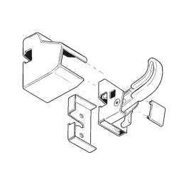 Hyttlås, vänster, svartlackerat, inklusive monteringsbleck och skyddskåpa, med låsarm för nivåmekanism.