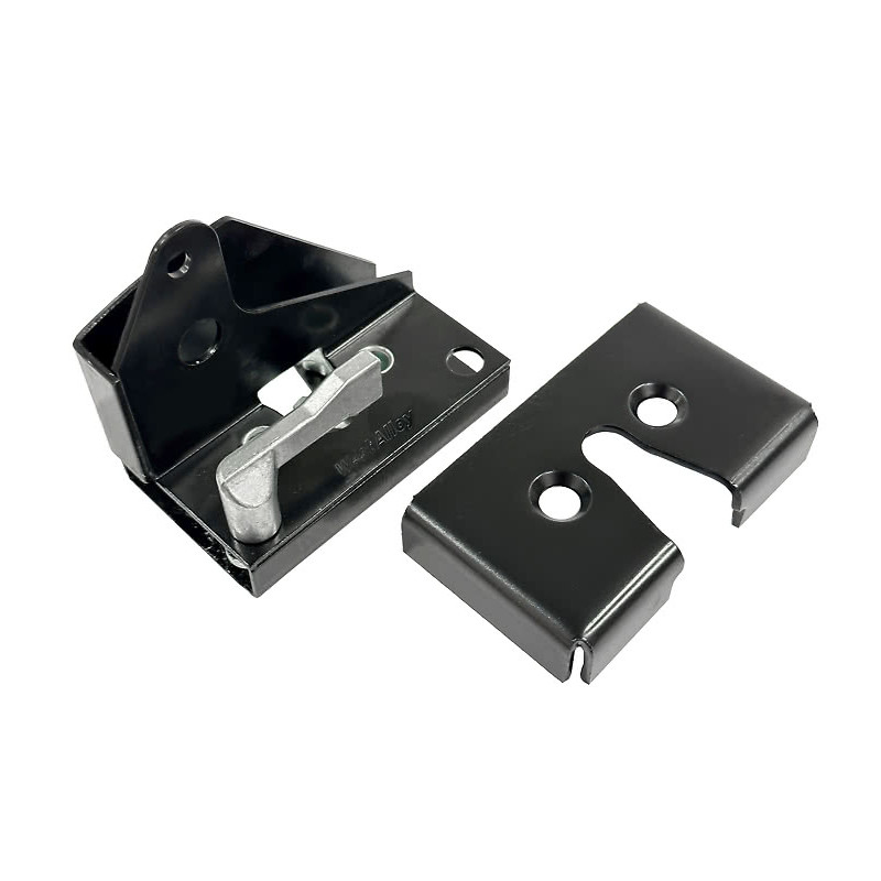 Hyttlås, höger, svartlackerat, inklusive monteringsbleck och skyddskåpa, med låsarm för nivåmekanism.