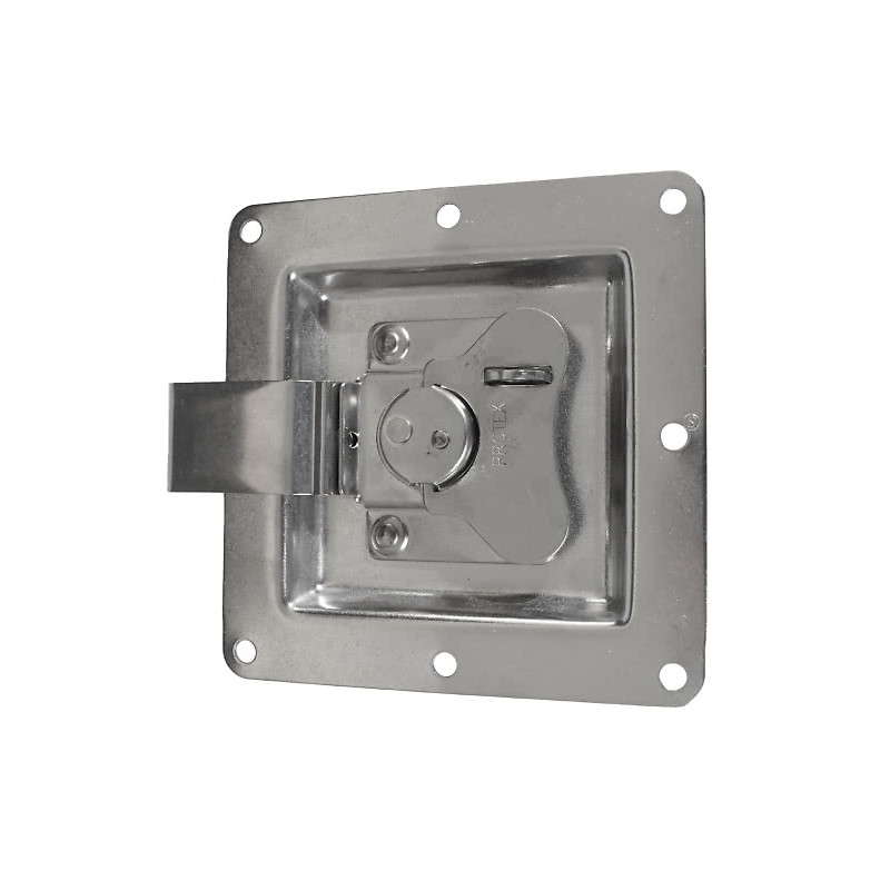 Lås med draghandtag. Med kåpa och monteringsbleck. Finns i utförande för höger och vänster.