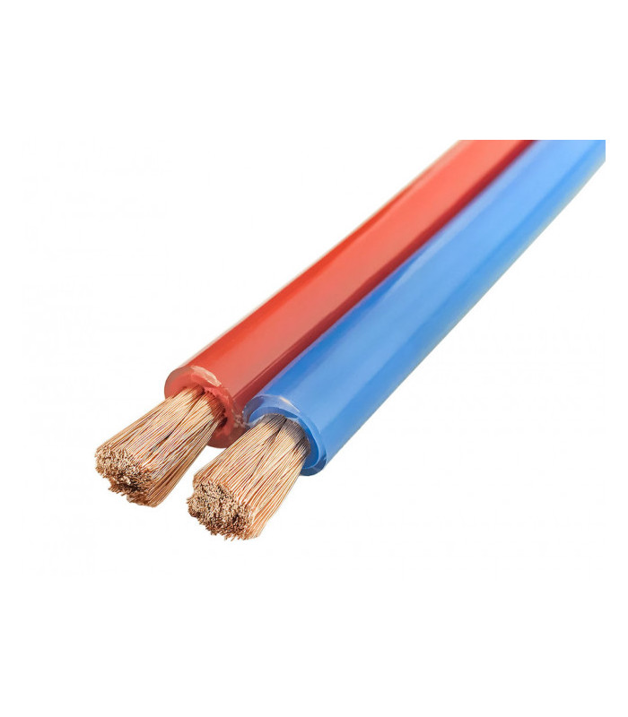 Mantel av köldbeständig transparent PVC. Olje-, syra- och värmebeständig. Temperaturområde -25°C till +70°C. Används t.ex. som laddningskabel för batterier. Färg: Blå/röd. Tvillingkabel med extra mångtrådig kopparledare. Pris per meter.