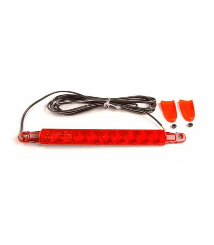 3:e högt placerad extrabromslykta 12/24V LED för bilar mellan 3,5–12 ton, röd 280 x 26 x 10 mm för påbyggnad med skruvfastsättning. LED-antal 10, Lyktglasfärg röd. Artikel för butik levereras med ryttare.