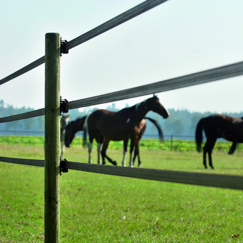 Den säkraste lösningen för din häst. Unika elektriskt ledande polymer (i svarta remsor) som kan användas som tråd i elstängsel. I kombination med stängselfjädrar ger den maximal säkerhet för hästar. Total diameter ø8mm med en kärna av ø2.5mm höghållfasthetstråd.