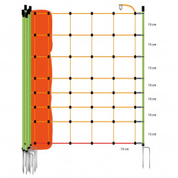 Komplett och enkelt att använda bärbara nät för getter och lamm. Om betesmarken gränsar till diken, erbjuder näten även de nyfödda lammen maximal säkerhet. Längd: 50m. Inklusive 14 stolpar med enkel eller dubbel spets, monterade i nätet. Det är enkelt att ansluta flera nät tillsammans.