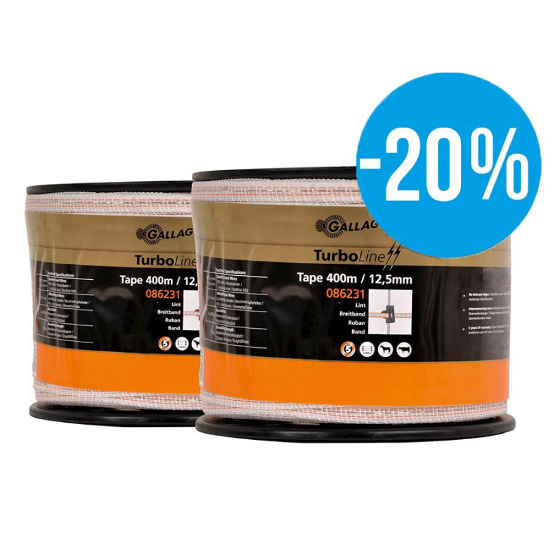 12,5mm TurboLine band. De vågräta trådarna är sammankopplade i intervall om 13 cm för att ge bättre ledningsförmåga. 40 gånger större ledningsförmåga än vanligt PowerLine band. Idealiskt för portabla elstängsel. Stolpavstånd upp till 5m. Spolar med 200m och 400m. Använd alltid TurboLine-produkter om
