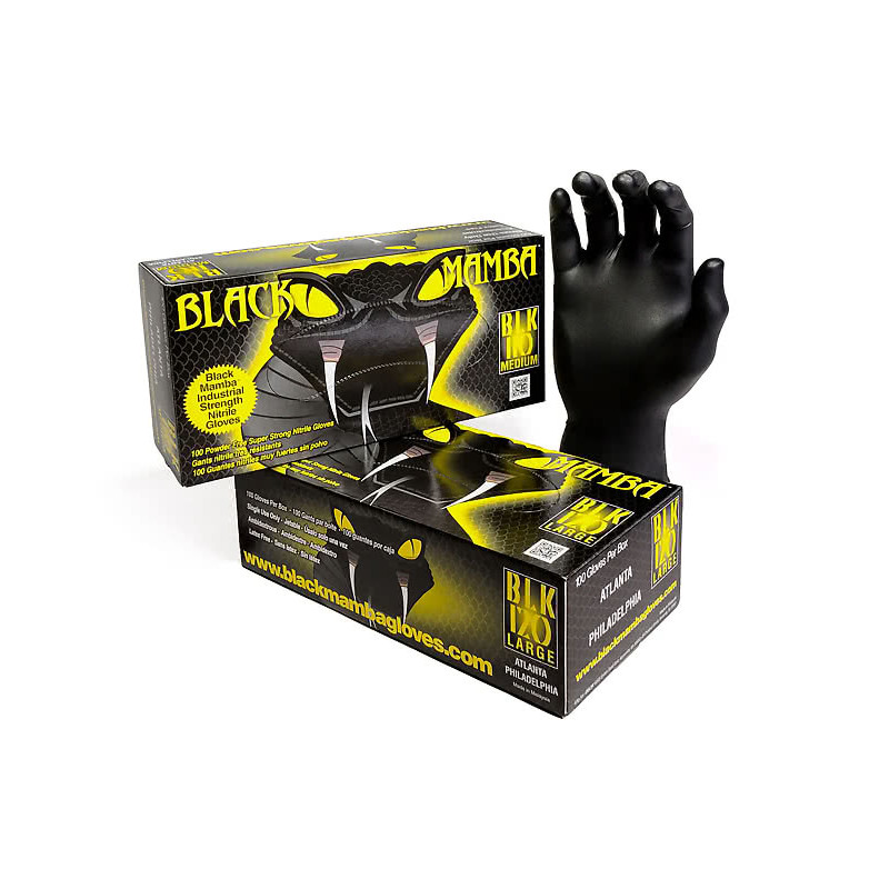 Black Mamba Nitrilhandskar: utformade av patenterad nitrilpolymer. Flaggskeppsprodukter av högsta kvalitet och de starkaste på marknaden. Denna nitrilhandske för engångsbruk är den starkaste av nitrilhandskarna samtidigt som den har enastående finess och fingertoppskänsla (Endast 0,16 mm tjocklek). Denna nitrilhandske för engångsbruk är puderfri och motståndskraftig mot många kemikalier samt punktering.