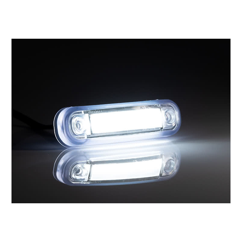 Sidomarkeringslampa vit LED 24 V med integrerad Superseal kontakt. • Spänning: 24 V • Lamptyp: LED• Färg: Vitt ljus• Kontakt: Superseal 2 stift • Montering: Horisontell+Vertikal • CC: 110 mm