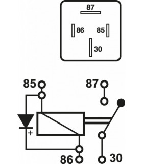 Växlande minirelä 5-stift med motstånd och fäste. Induktiva störspänningsstoppar i spolen begränsande med parallellmotstånd till < 90 V. Med flatstiftsanslutningar 6,3 mm. Belastbarhet (vid +80°C) 40/20 A vid 24 V. H-nr: 4RD 007 903-011. Fabrikat: Hella