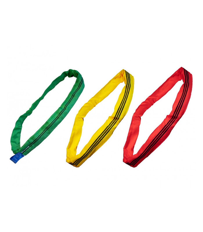 Sömlös rundsling med säkerhetsfaktor 7:1 och enkelduk. Finns i olika längder och färger.