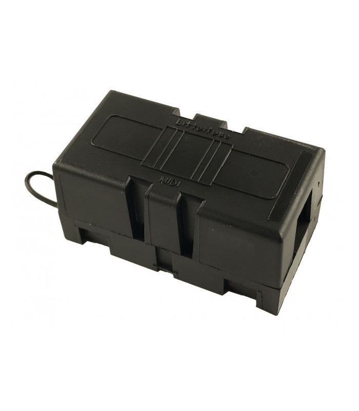Säkringshållare MIDI 4-fack ihopkopplingsbar med högt lock. Material i svart hårdplast. Bultar i storlek M5 x 14 som är förmonterade. Över- och underdel kan fästas ihop. Åtdragningsmoment: max 4,5 Nm.