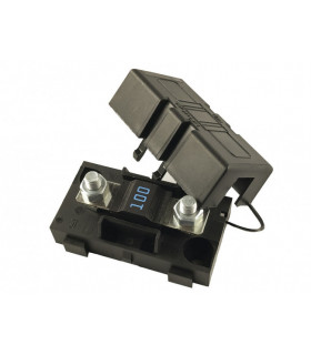 För MEGA®-säkringar upp till 500 A. Totallängd 120, bredd 40 mm. Exkl. säkring. Clips och 2 st M8 bultar håller säkringen på plats. Kan byggas ihop till plint.