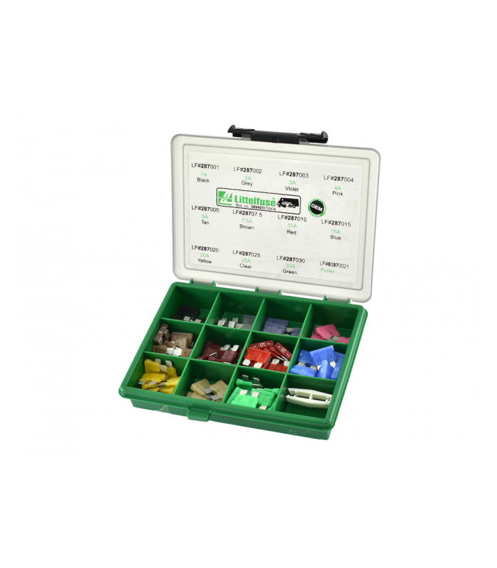 Säkringssortiment för MINI Plug-in säkringar. Innehåller: 100 st MINI Plug-in säkringar mellan 2 och 30 A samt 1 st säkringsverktyg.