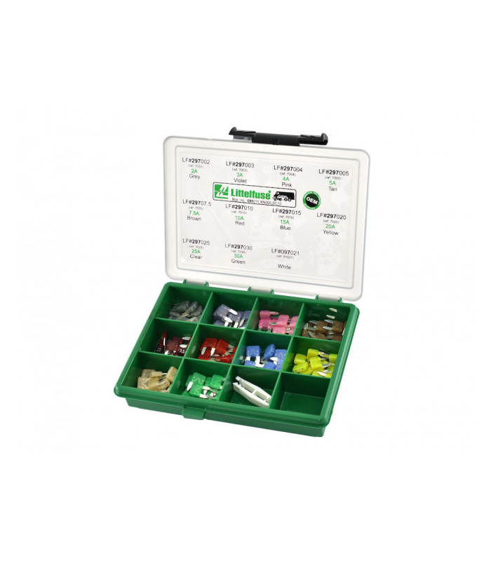 Säkringssortiment för ATO Plug-in säkringar. Innehåller: 100 st ATO Plug-in säkringar mellan 1 och 30 A samt 1 st säkringsverktyg.