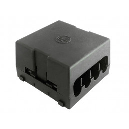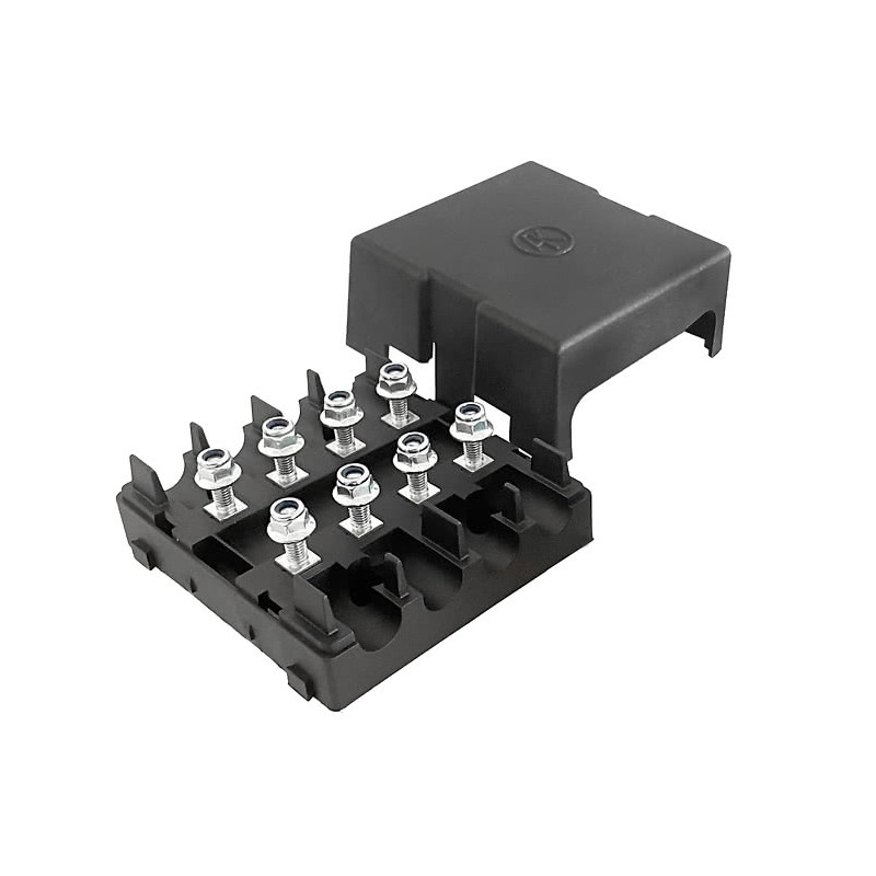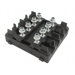 För MEGA®-säkringar upp till 500 A. Totallängd 120, bredd 40 mm. Exkl. säkring. Clips och 2 st M8 bultar håller säkringen på plats. Kan byggas ihop till plint.