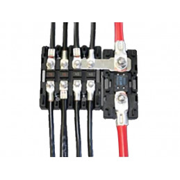 För MEGA®-säkringar upp till 500 A. Totallängd 120, bredd 40 mm. Exkl. säkring. Clips och 2 st M8 bultar håller säkringen på plats. Kan byggas ihop till plint.