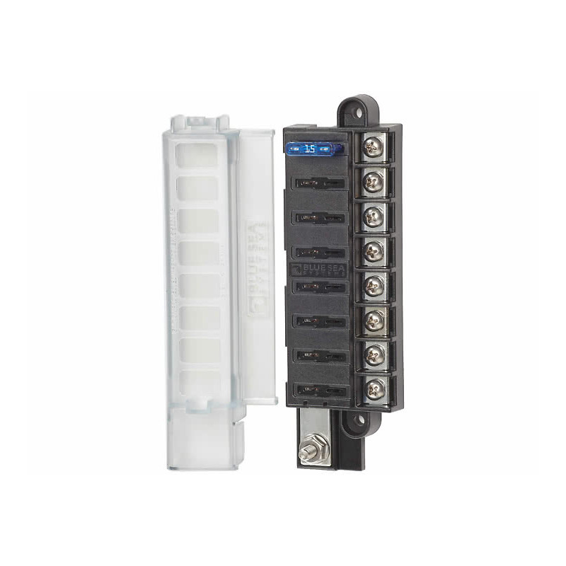 Säkringshållare 4st (alt. 8st) säkringar Blue Sea System kretsskydd för ATO®/ATC®-säkringar i ett kompakt format. Tändningen är skyddad när locket är stängt och uppfyller ISO 8846 och SAE J1171 för användning i motorutrymmet. Isoleringskåpan uppfyller kraven för ABYC/USCG-isolering. Tennpläterade kopparbussar och säkringsklämmor. Ström: max 30 Amp/säkring och max 100 Amp/säkringsdosa. Kan t.om. monteras mot ett hörn eftersom alla anslutningar sitter på en sida.