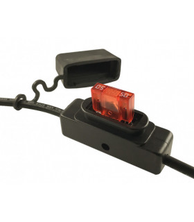 Säkringshållare med huv av gummi som skydd mot smuts och fukt vid montering på utsatta ställen. För Maxi-säkringar upp till 60 A. 2 st 130 mm långa kabeländar i 13 mm² är förmonterade.