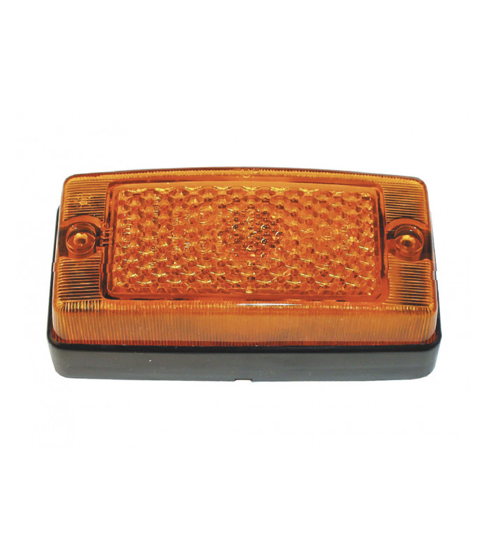 Sidomarkeringslampa med orange plastglas och reflex, samt svart sockel.