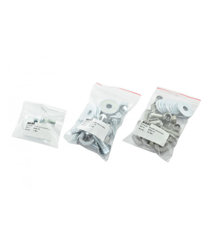 Skruvsatser till aluminiumprofil. Vagnsbult, låsmutter och bricka ingår, elförzinkade. 1 sats = 1 vagnsbult, 1 låsmutter, 1 bricka. Förpackningsstorlek: 10 st/25 st.