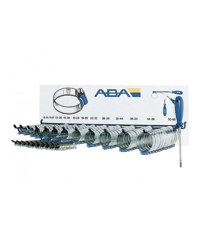 1853- Ett komplett slangklammerställ som innehåller 144 st slangklammer (8-65 mm) och 100 st miniaba (8-17 mm) samt hylsmejsel. 65 cm. 1853.01 - Endast slangklammerställ 65 cm 1853.02 - Endast slangklammerställ 90 cm