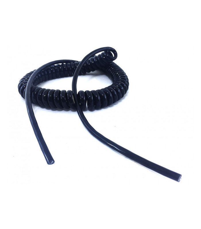 Spiralkabel 5-ledare med kabelarea 5x0,75 mm². Effektiv arbetslängd 3,5 meter. Diameter spiral 25 mm. Diameter kabel 7 mm. Färg på innerledare: blå, grön, gul, svart och brun. Ytterhölje i svart TPU (Termoplastisk Polyuretan).